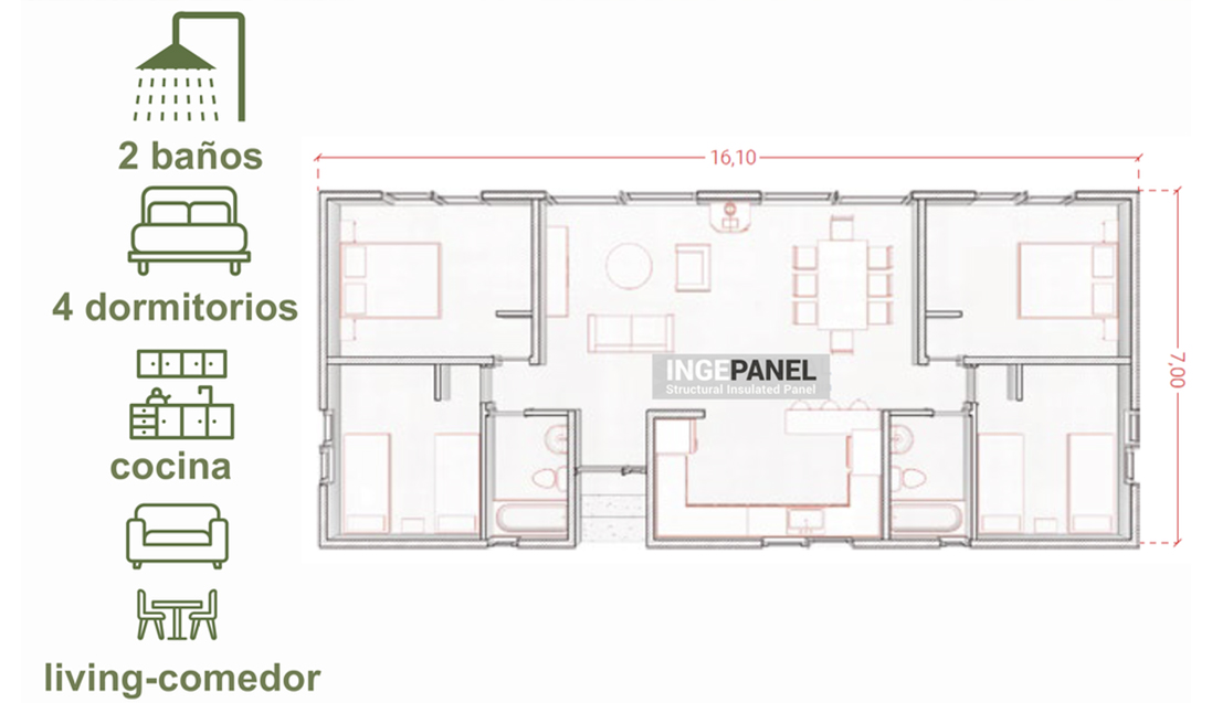 - Paneles SIP dimensionados y enumerados, fijaciones para montaje, uniones como maderas impregnadas y clavijas, charla de induccion y seguimiento en obra.